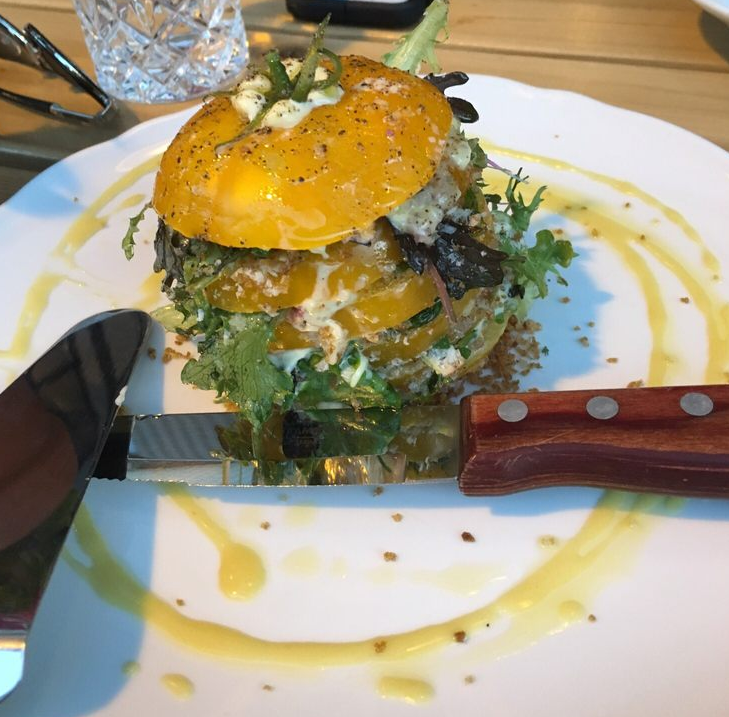Our next choice, the vegetable salad didn’t disappoint and was by far the star of our meal. A beautiful plate of an endless variety of fresh vegetables were lightly dressed and topped with an unusual but delicious quenelle of corn milk sorbet. A vegetarian’s delight. Yum!