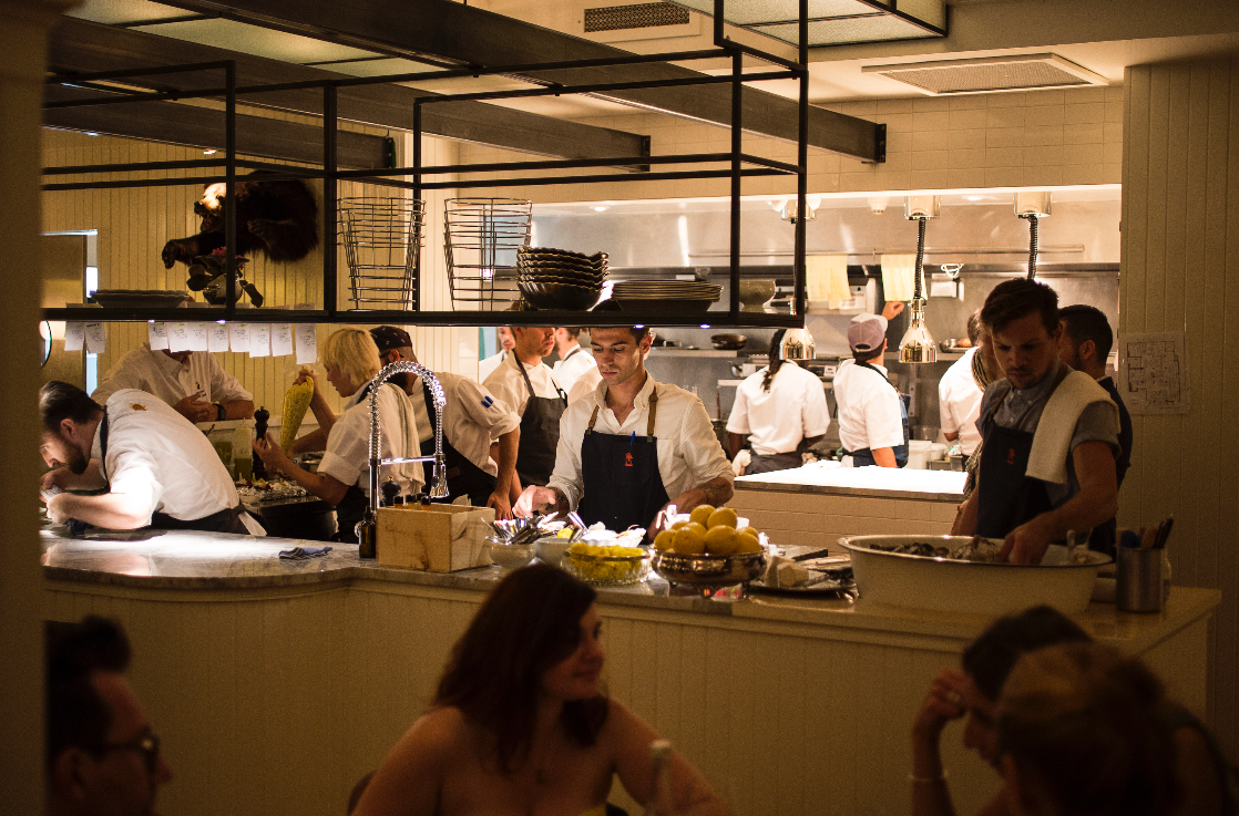 Montreal Plaza, located incongruously amongst the many bridal stores on St Hubert, whimsically manages to combine glamour with hominess, not an easy task. The restaurant, designed by Zebulon Perron, is gorgeous. Linen topped tables are artfully spread about the space and in small private alcoves on different levels all fronting a gleaming open white kitchen and interspersed with teddy bears, toy airplanes hanging from the ceiling, old suitcases and even a bookcase filled with children’s book and other paraphernalia. Its homey, elegant and…fun!