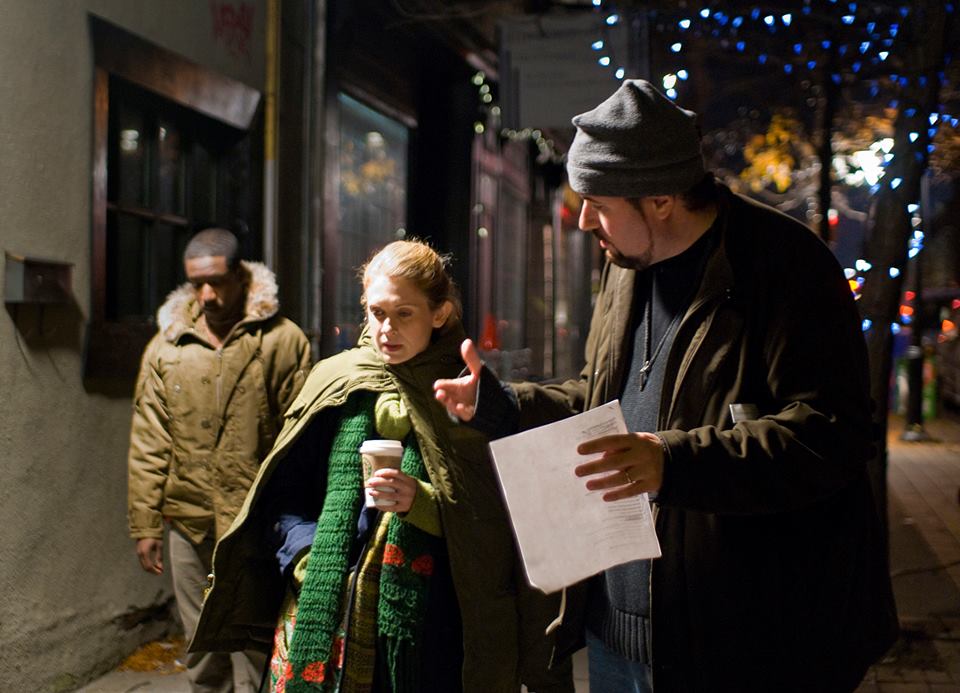 Nocturne director Saul Pincus (right) discusses a scene with actors Knickoy Robinson (left) and Mary Krohnert (centre) while filming on the streets of Toronto. (Photo: James Belardo)