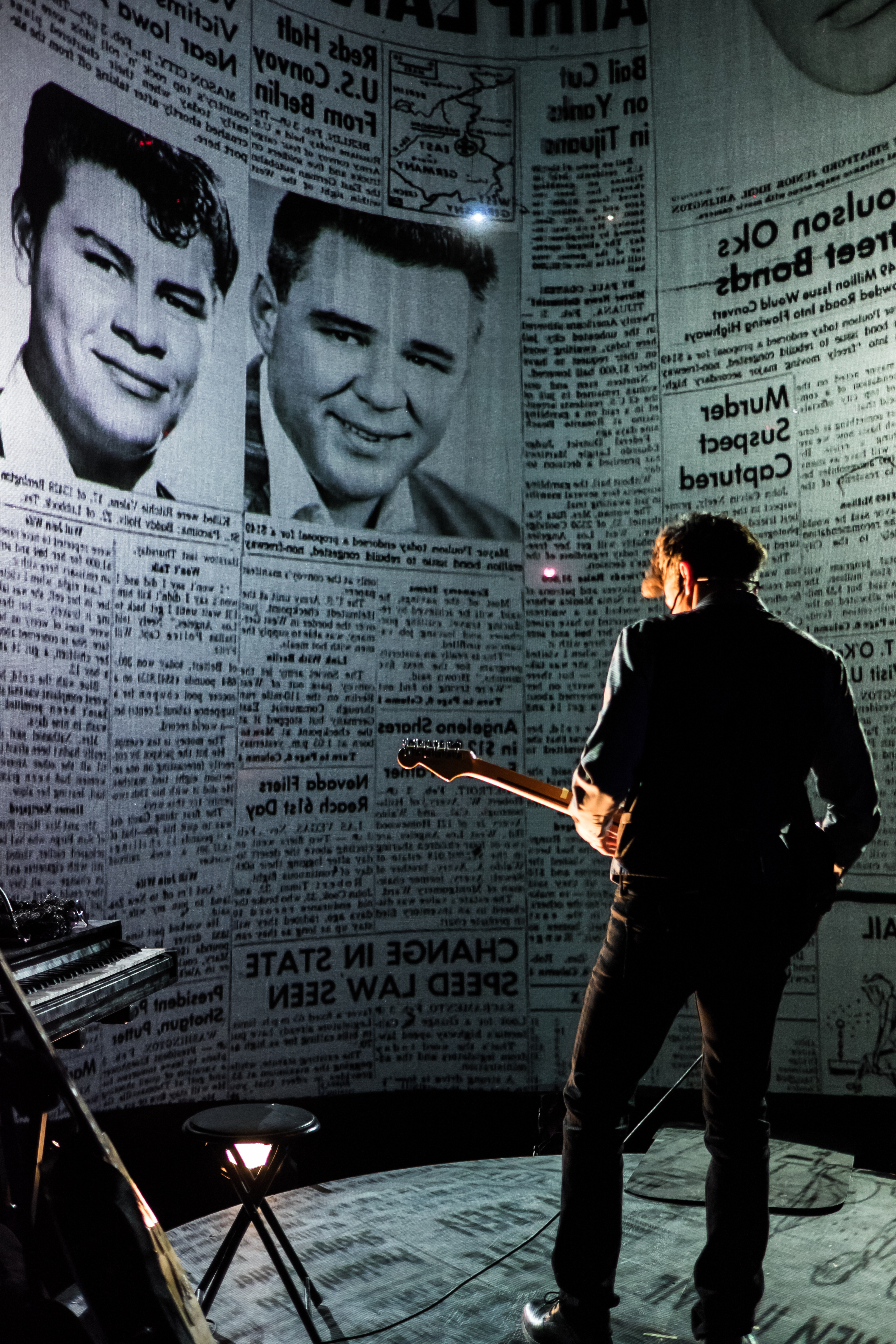 The show features visual images and video of newscasts, advertisements, bits of historical facts, and TV show clips. However, it is not a bombardment of information. The images are selected to reflect the experiences of the three characters and how it all comes together as a whole. Events are not stand-alone. People are not isolated either. The world touches each person at the same time as they move the world. In a sublime metaphor, an image of Sputnik orbits the stage, as the show presents the larger symbol of how history is cyclical.