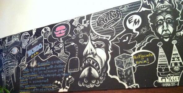Ta Chido is small to be sure with a small , very small , sit up bar with just a couple of stools, maybe 8 or 9 formica covered diner tables inside and a cute pint sized patio on the sidewalk. The overall ambience is pure Mexican kitsch replete with a multi media display of ‘great whites’ both on canvass and as plaster of paris replicas fiercely protruding from the walls. One wall is humorously adorned by a graffiti filled blackboard and a life size replica of R2D2 ensconced in an over sized sombrero sits on a shelf cautiously guarding the cash register.
